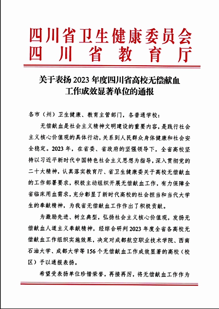 近日,四川省卫生健康委员会和四川省教育厅联合发文《关于表扬2023年度四川省高校无偿献血工作成效显著单位的通报》,开元官网荣获“2023年度四川省高校无偿献血工作成效显著单位”称号。2023年,党委学生工作部坚持以习近平新时代中国特色社会主义思想为指导,高度重视无偿献血等志愿公益活动。认真落实教育厅、省卫生健康委及各级红十字会关于无偿献血的工作部署要求,将无偿献血作为引领大学生践行社会主义核心价值观的重要载体。多形式、...