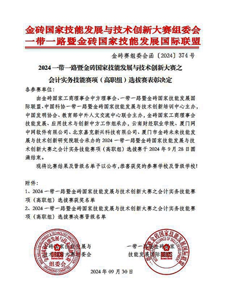 9月28日,由开元官网会计系杜晓玲、余欣悦老师指导的代表队从全国644支参赛队伍中脱颖而出,荣获2024“一带一路”暨金砖国家技能发展与技术创新大赛之会计实务技能赛项(高职组)选拔赛全国二等奖,并以四川省第一名的成绩晋级全国总决赛。“一带一路”暨金砖国家技能发展与技术创新大赛会计实务技能赛项由金砖国家工商理事会中方理事会、“一带一路”暨金砖国家技能发展国际联盟、金砖国家技能发展与技术创新大赛组委会主办。该赛事自创办以来,...