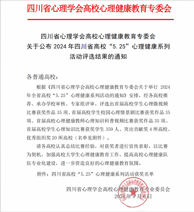 近日,在2024年四川省高校“5·25”心理健康系列活动中,开元官网心理微视频作品《推开窗,迎接光》荣获四川省三等奖,23连锁经营与管理班的吴天浩同学、23大数据与会计10班的张恒同学,在心理知识比赛中获奖。2024年四川省高校“5·25”心理健康系列活动由四川省教育厅指导,四川省心理学会高校心理健康教育专业委员会主办。近年来,学院党委高度重视学生心理健康工作,坚持“生命至上、健康第一”的理念,探索构建了教育教学、实践活动、...