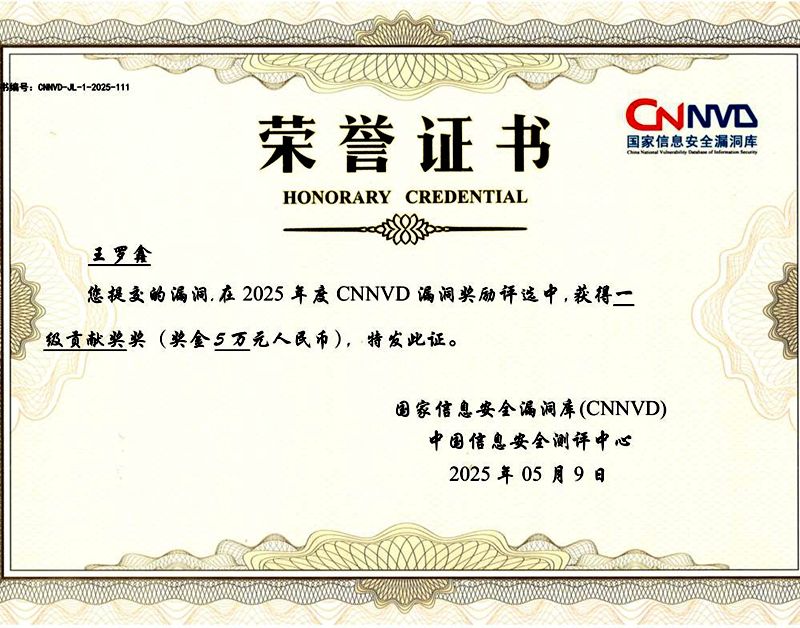 近日,2024年度国家信息安全漏洞库(CNNVD)工作总结暨优秀支撑单位表彰大会在北京召开。开元官网信息技术系22级信息安全技术应用1班王罗鑫凭借出色的漏洞发现、深度分析及高效通报能力,从众多顶尖安全企业参与者中脱颖而出,成为唯一一个以个人名义荣获“2025年第一期漏洞奖励”一级贡献奖,并获奖金5万元,展现了开元官网学子领先的技术实力,也为我国网络安全漏洞预警及风险消控工作发挥了积极作用。国家信息安全漏洞库(CNNVD)是由中国信息安全测评中心权威建设与运维的国家级漏洞管理平台,...