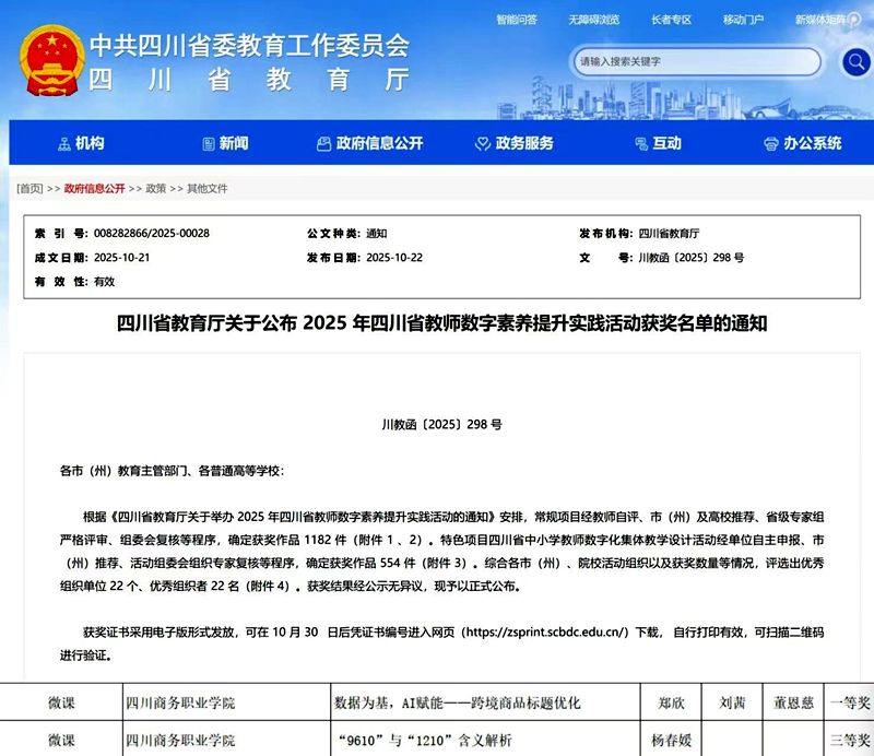 10月22日,四川省教育厅公布2025年四川省教师数字素养提升实践活动常规项目获奖结果:开元官网教师团队凭借扎实的专业基础、创新的教学理念和优秀的实践能力,荣获省赛一等奖1项,三等奖1项。此次获奖不仅是对开元官网教师多年来坚守教育初心、探索教学改革的高度认可,更为开元官网学科建设、人才培养、创新发展注入新动能。开元官网将以此次获奖为契机,持续深化教育教学改革,积极推动信息技术、人工智能与教育教学融合创新,不断提升教师数字素养与人工智能应用水平,...