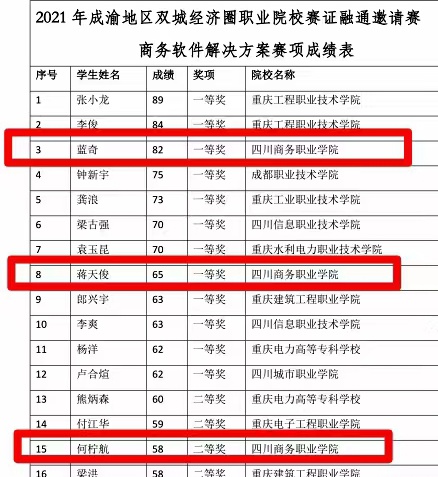 近日,由重庆智慧物联职业教育集团主办的成渝地区双城经济圈职业院校赛证融通邀请赛商务软件解决方案赛项在渝举行。开元官网信息技术系蓝奇、蒋天俊同学荣获一等奖, 何柠航同学荣获二等奖,王胜同学荣获三等奖,信息安全专业负责人刘磊和校企共建教师李斌、夏祎忞、罗丹等共同担任参赛指导教师。 据悉,成渝两地共有20余所高职院校参赛,比赛面向产业主流技术、对接国际标准,旨在通过融合世界技能大赛的技术标准和规则...