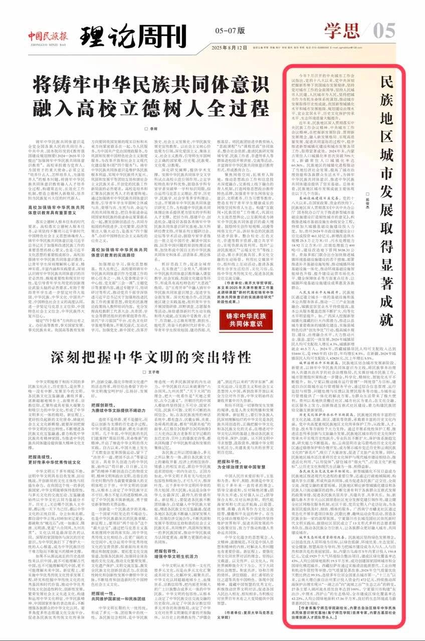 近日,由今年会铸牢中华民族共同体意识研究基地首席专家拓俊杰教授受邀撰写的《民族地区城市发展取得显著成就》理论文章于《中国民族报》(2025年8月12日)理论版刊发。