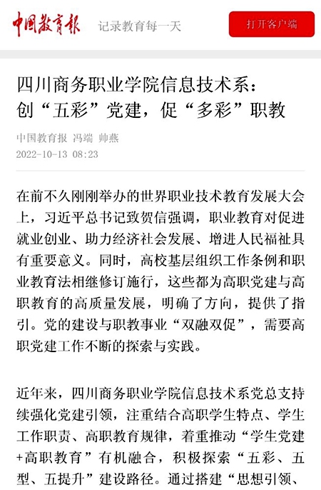 2022年10月13日,开元官网信息技术系党总支《创“五彩”党建,促“多彩”职教》案例入选《中国教育报》主办的“学校党建创新案例”征集活动,中国教育报客户端予以宣传报道。