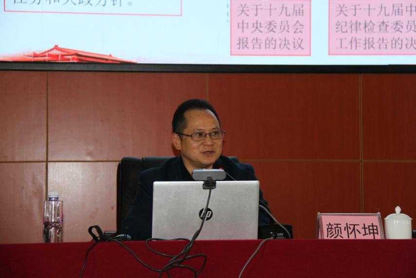 报告会上,颜怀坤以“中华民族伟大复兴何以能‘赢’”为题,以“说文解字”新颖的形式,分为定心、定力、定法三部分解读。颜怀坤博闻强记,历史文化典故、时事政治案例,信手拈来,侃侃而谈。整个报告主题鲜明,阐释深入浅出,语言生动接地气,很多与会者都认真地做笔记,报告会在教职工中引起热烈反响。