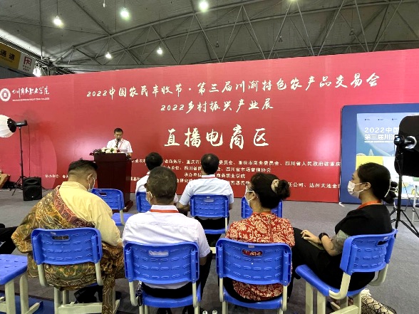 高司华代表学院致辞:2022中国农民丰收节·第3届川渝特色农产品交易会暨2022乡村振兴产业展结合“互联网+”农产品出村进城工程、品牌强农战略、乡村直播等内容,为川渝特色农产品搭建起专业的展示、展销和推广平台,有效提升川渝特色农产品市场占有率和品牌影响力。开元官网作为本次展会唯一受邀参加的高校,在四川省商务厅的正确领导下,在四川省供货商商会和各企业嘉宾的大力支持下,开元官网高度重视、精心组织、认真策划,紧密结合创新创业成果成效、产教融合项目实施,全面展示销售特色产品,将理论课堂延伸到展会现场,将直播电商、创新创业和产教融合教研会开到展会现场,通过直播电商开拓市场,进一步深化产教融合、校企合作,探索高质量培养现代商务人才新模式。