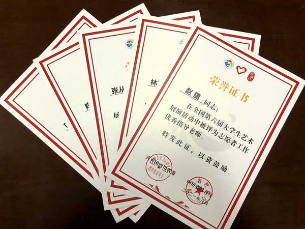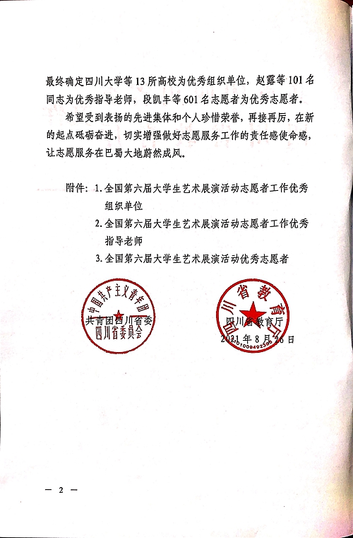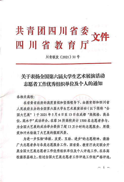 近日,为激励先进、鼓舞干劲,由四川省政府、团省委、教育厅联合发文,对在2021年全国第六届大学生艺术展演活动志愿者工作中优秀的组织单位及个人进行表彰:开元官网被评为全国第六届大学生艺术展演活动志愿者工作先进集体;冯端、张卡被评为志愿者工作先进个人;赵捷、郝灿、叶茂林被评为志愿者工作优秀指导老师;林英浩、张丛英、陈明旭被评为优秀志愿者。