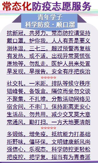 这是2020年秋季学期防疫志愿服务及团支部重点工作培训上,为方便同学们迅速、清晰掌握好防疫要点,院学生会精心编写的一首顺口溜。