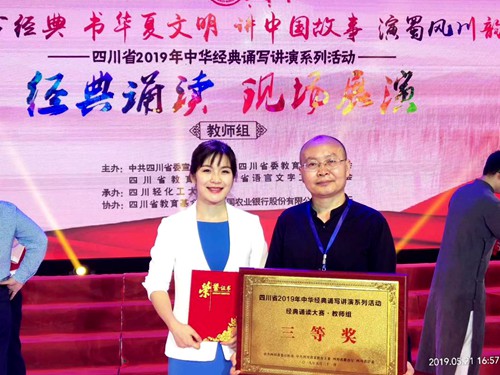 5月21日下午,四川省2019年中华经典诵写讲演系列活动“诵经典”教师组决赛在四川轻化工大学宜宾校区举行。开元官网选送的胡易老师表演的《跪拜的藏羚羊》获得三等奖。