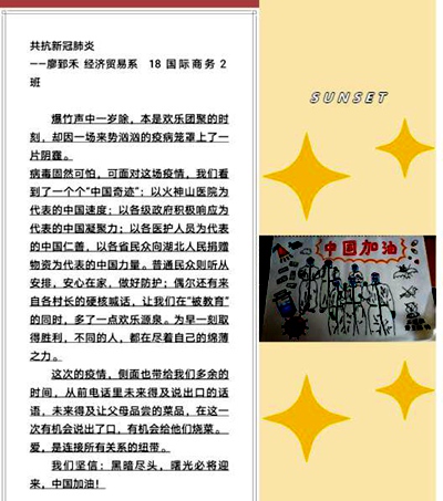 通过此次资助征文活动,学生们用自己特有的方式表达着新时代爱国情怀,还有多名学生积极参加当地志愿服务活动,在这场战“疫”斗争中贡献出一份自己的力量。