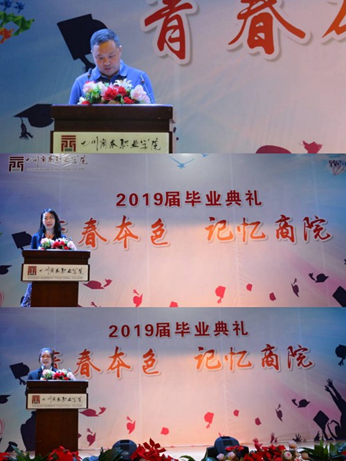典礼在雄壮的国歌声中正式拉开帷幕。院长高司华、副院长许丹雅分别在两个校区为毕业生致辞。高司华院长在致辞中希望同学们“不忘初心,砥砺前行”,不断努力创造自身价值,并将个人的发展同祖国的命运紧密结合;许丹雅副院长鼓励毕业生“历经芳华,不负青春”,立足岗位、胸怀梦想、不懈奋斗。优秀教师代表王璐、张潇老师分别发言寄语毕业生,表达了全体老师对毕业生的祝福和期盼,愿同学们带着智慧与坚韧勇往直前;杰出校友罗成明分享了个人成功经验。此外,优秀毕业生代表谭晓颖和陈艺,回顾了愉快充实的三年校园生活,表达了对母校的感激与不舍,以及作为商院学子,努力追梦、不负青春的决心。