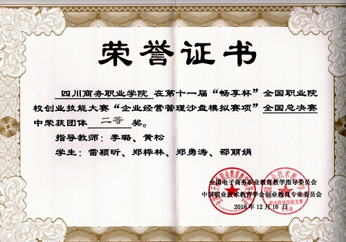 本次大赛由全国电子商务职业教育教学指导委员会、中国职业技术教育学会创业教育专业委员会主办,成都职业技术学院承办,中教畅享(北京)科技有限公司提供技术支持。来自全国各地的153所高职院校参加了此次比赛。经过两天激烈的角逐,两支代表队发挥出色,奋力拼搏,最终战胜竞争对手。16级药品经营与管理专业的杨洪鑫、李厢弈,17级市场营销专业的刘睿涛、李田果获得全国一等奖,16级药品经营与管理专业的雷颖昕、郑桦林,17级市场营销专业的郑勇涛、邵丽娟获得全国二等奖,为学院增光添彩!