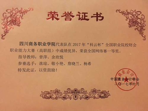 本次大赛由中国商业会计学会主办,山西省财政税务专科学校、厦门科云信息科技有限公司承办,科云学堂协办。此前,全国近300所院校的2400余名选手参加了2017年“科云杯”全国职业院校财会职业能力大赛(高职组)的全国网络选拔赛,开元官网会计系代表队在全国网络选拔赛中获西部地区一等奖,并代表四川省参加此次的全国总决赛。会计系学生杨希、詹晓兰、王钦逸和王姣在指导教师余欣悦、曾萍的带领下代表学院赴太原参赛。经过长达六个小时的激烈角逐,最终获得全国总决赛团体三等奖。同时,余欣悦、曾萍老师获得“优秀指导老师”荣誉称号。