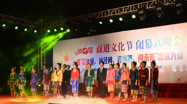 闭幕晚会是通过一台精彩纷呈的诵读大赛的形式呈现。参加本次比赛的分别是六系选送上来的六支代表队,以及来自国合中心、和盛校区大学生艺术团、文家校区大学生艺术团、社团联合会带来的表演。闭幕晚会在文家院团委大学生艺术团《丝路之光》的精彩表演中拉开帷幕。通过激烈的角逐,经营管理系选送的《松花江上》夺得冠军,旅游管理系选送的《凤求凰、白头吟》和经济贸易系选送的《钢铁》获得亚军,信息技术系选送的《写给未来的你》、会计系选送的《满江红》、设计艺术系选送的《水调歌头》获得季军。在此次晚会中由国合中心老挝留学生带来的老挝民族舞蹈《占芭花》为我们呈现了来自“万象之国”的异域风情。最后,晚会在由和盛校区大学生艺术团带来的民族舞蹈《花儿为什么这样红》中落下帷幕。