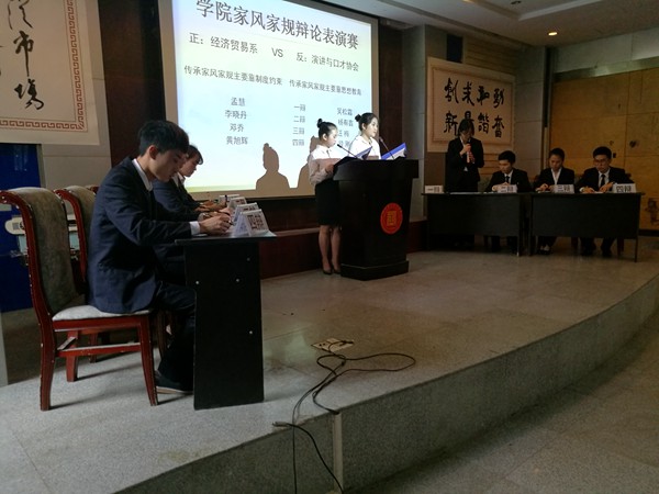 本次辩论赛为了落实全面从严治党和反腐倡廉工作,积极践行社会主义核心价值观,弘扬中华传统家庭美德,传承良好家规家风,推进学院廉洁教育和廉政文化建设工作。比赛由学院第四届商道与法律辩论大赛冠军队经济贸易系代表队迎战学院演讲与口才协会辩论队。两队围绕“传承家风家规主要靠法制约束还是思想教育”展开激辩,双方队员在思政教学部老师指导下,准备充分,旁征博引,分析入理,轻松幽默,场面精彩。互动阶段台上台下深刻交流,思辨氛围浓厚。最后,演讲与口才协会代表队以一分险胜。黄旭辉和段刚获得当场最佳辩手称号。