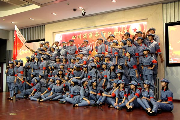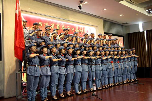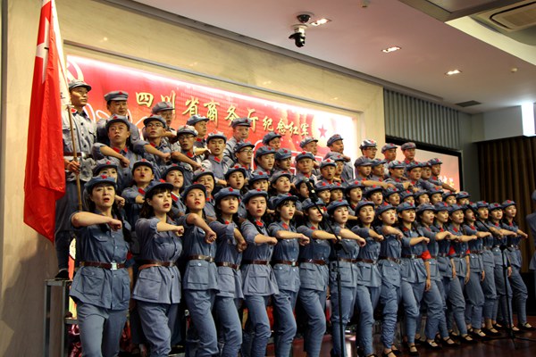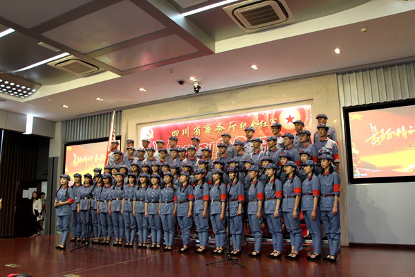9月29日下午2:00,四川省商务厅纪念红军长征胜利80周年红歌会在厅机关隆重举行,开元官网全体院级领导及部分师生代表近80人参加了本次红歌会。历时一个多月的精心编排和悉心准备,开元官网党委宣传部、工会负责组织并选送的大合唱《突破封锁线》排在第九个节目出场,师生们以深情的朗诵、优美的歌声、甜美的笑容、和谐的动作、唯美的画面赢得了全场观众雷鸣般的掌声,给大家留下了深刻的印象,最终取得一等奖的优异成绩。