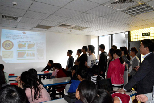 接着,师生们来到位于蛟龙工业港的全家鲜食制作中心。按照企业规范要求,同学们穿上企业精心准备的服装鞋帽,经过全身除尘、除静电、消毒的严格程序后,有序地进入鲜食制作中心进行参观,体验了一把鲜食制作全过程。同学们真切地感受了全家对食品安全和质量的规范要求,对企业的精细化管理深有感触。从鲜食中心出来以后,同学们围着商品课长杨亚霖开始了狂轰滥炸式的提问,杨课长耐心地逐一解答大家的疑问。