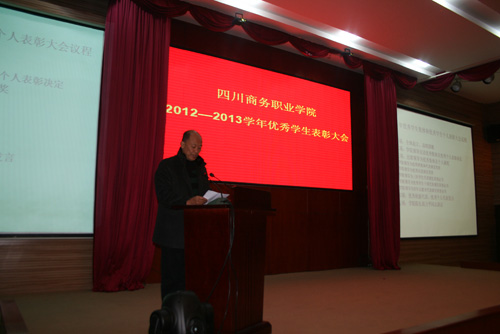12月24日下午,学院2012-2013学年度优秀集体及个人表彰大会在学院和盛校区商务信息交流中心隆重举行。学院党委书记舒维霖,院长高力平,副院长郎松亭、向宏志,纪委书记官培生出席了会议并为获奖学生颁奖。学院相关部门负责人、各系部书记,和盛校区学工系统全体老师、优秀学生代表200余人参加了大会。表彰大会由副院长郎松亭主持。