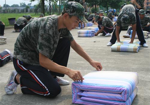 1500余名军训新生在规定的时间内把被子叠的整整齐齐、有棱有角、方方正正。最后评选出10名被子叠得非常优秀的同学,并将这些优秀学员叠的被子向全团展示。