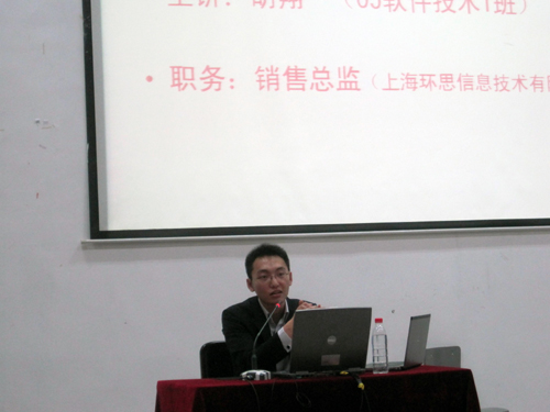 4月5日晚6:30分学院和盛校区的学术讲座厅座无虚席。原开元官网信息技术系2008届软件技术2班学生,现任上海环思技术有限公司销售总监胡翔一为全院学生带来了一场精彩的毕业生就业及成才专题报告会。胡翔一是环思企业奖学金获得者,2008年毕业后去到环思企业,经历近四年的奋斗,从环思销售顾问到销售经理再成为环思企业的销售总监,他在逆境中的坚持、做人的态度、对企业的责任等点点滴滴都成为了同学们关注的话题。同学们从报告中既感受到了电子信息技术在现代商务流通领域中的重要性,也明确了自己在校期间的学习任务,从而更加坚定了自己今后的发展方向和目标。