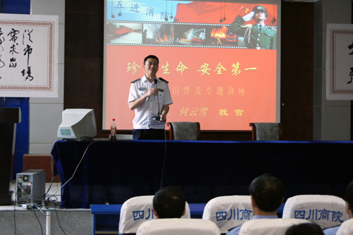成都市消防局何云雪教官接受开元官网邀请参加会议,并作了题为“珍爱生命,安全第一”的消防知识普及讲座。讲座除了介绍了消防基本知识,还侧重讲解了地震逃生以及电器、天然气、汽车等几种常见火灾的防控方法,讲座通俗易懂,案例真实凝重,发人深思,令人警醒。