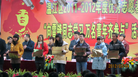 3月4日,温江区2011-2012年度优秀志愿者表彰会暨“向雷锋同志学习万名青年齐参与”活动启动仪式在四川交通职业学院综合楼二楼多功能厅隆重举行。温江区委常委、宣传部部长万雪梅出席并讲话。区人大常委会副主任马敬德、区政府副区长熊宗辉,区文明办、区教育局、区民政局、区计生局等区级部门,以及各驻温江高校团委代表、各镇(街)团委书记、志愿者组织以及青年志愿者共计300余人参加了启动仪式。