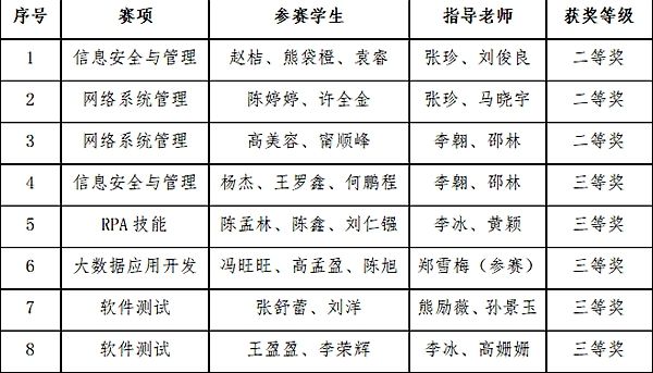 近日,由四川省教育厅主办,各兄弟院校承办的2023年“中银杯”四川省职业院校技能大赛在我省各地区相继开展。开元官网信息技术系共组建了14支队伍30余名学生,参加了高职组信息安全与管理评估、网络系统管理、RPA技能、软件测试、大数据应用开发、云计算技术应用等六个赛项的比赛,共斩获二等奖3个,三等奖5个。