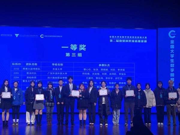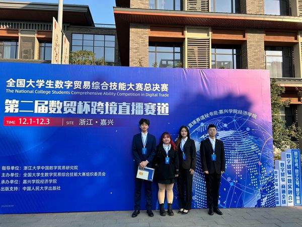 由经济贸易系跨境电商、国际商务、智慧健康养老服务与管理专业学生王建杰、黎伍淘、李欣宇、邱艺佳四位同学组成代表队,沉着应赛,在对外经贸大学、宁波大学等六十支决赛队伍中脱颖而出,勇夺桂冠。董恩慈、刘茜老师荣获优秀指导老师。