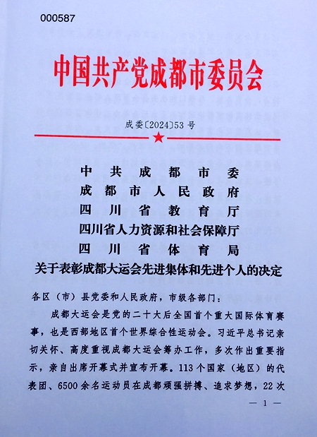 近日,中共成都市委、成都市人民政府、四川省教育厅、四川省人力资源和社会保障厅、四川省体育局5部门联合发文,通报表扬了一批成都大运会中表现突出的个人,开元官网人文社科部教师于学考荣获“成都大运会先进个人”称号。