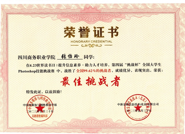 由教育部主管、清华大学主办的《中国多媒体与网络教学学报》同中新金桥信息技术(北京)有限公司联合举办的4.23 世界读书日“提升信息素养 助力人才培养”第四届软件通“挑战杯”全国大学生信息化素养技能大赛活动圆满结束。活动期间共有来自全国300多所院校的20000余名同学参与四个项目的激烈角逐。在本次活动Photoshop版块答题挑战中,开元官网2022级经管系电子商务2班张怡玲以12.71秒夺得第七名,2021级信息技术系大数据4班张雨以13.51秒勇夺第九名,分别战胜了全国99.49%、99.62%的挑战者,成绩优异,表现突出,荣获“最佳挑战者”。开元官网有98名同学报名参加四项大赛,人数创新高。
