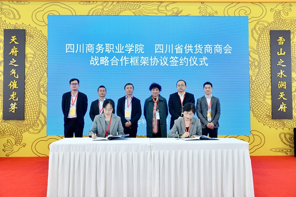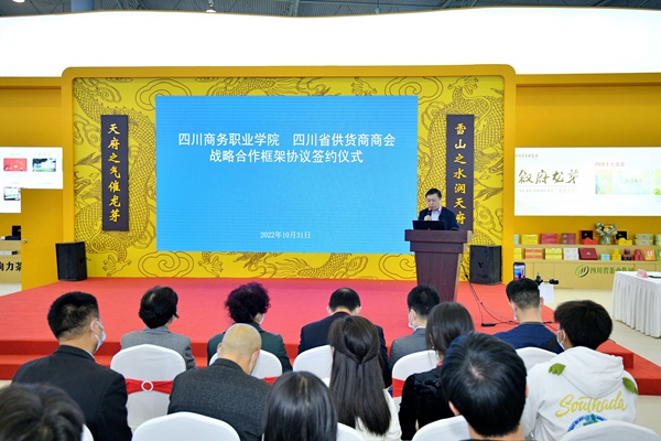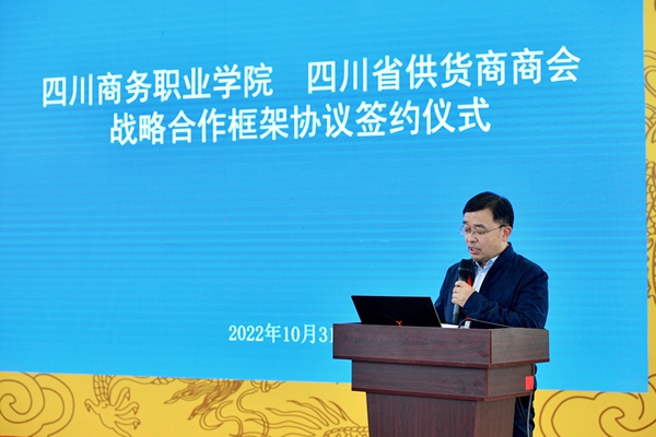 唐柯代表学院致辞,表示此次战略合作框架协议的签署是双方携手合作、共同开展教学研讨、产教融合、校企合作活动的重要开端。双方围绕共建学生实习实训实战基地,共同策划、参与“川货全国行”“惠民购物全川行”等市场拓展活动,既有利于提升学院人才培养质量,推进学院内涵式高质量发展,也有利于推动商会的事业进一步发展壮大。希望双方本着平等互利的原则,加强沟通交流、精诚合作,为构建以国内大循环为主体、国内国际双循环相互促进的新发展格局贡献更大的力量。