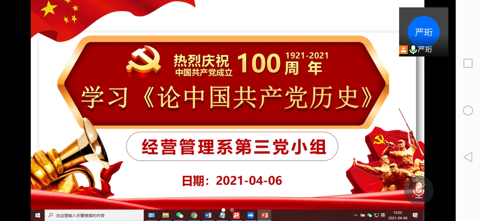 深入学习贯彻习近平新时代中国特色社会主义思想,推动“不忘初心、牢记使命”主题教育常态化、制度化,以庆祝中国共产党成立 100 周年为契机,2021年4月6日,经管系组织召开了主题为“百年风雨,铸就辉煌”的党小组会...