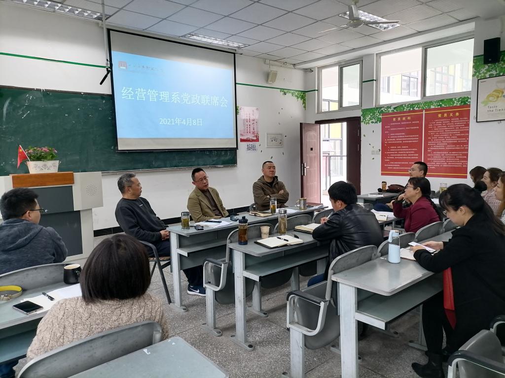 2021年4月8日全天,经营管理系“党政联席会”、“毕业生工作会”、“专业建议会”于第一教学楼202室如期举行。出席本次会议的有学院副院长许丹雅同志、学院纪委书记李文川同志、经营管理系主任梁栋同志、经营管理系党...