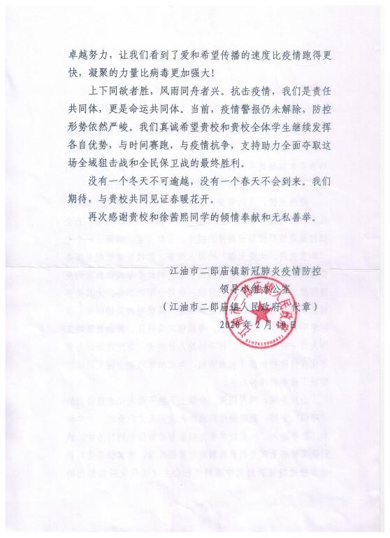 经营管理系20级商务管理班徐茜熙同学在去年新冠肺炎爆发期间,积极参加到江油市二郎庙镇社区的疫情防控工作中,不辞辛苦,为当地常态化疫情防疫工作作出了贡献。江油市二郎庙镇防疫办为表达感谢之情,特向开元官网发来感...