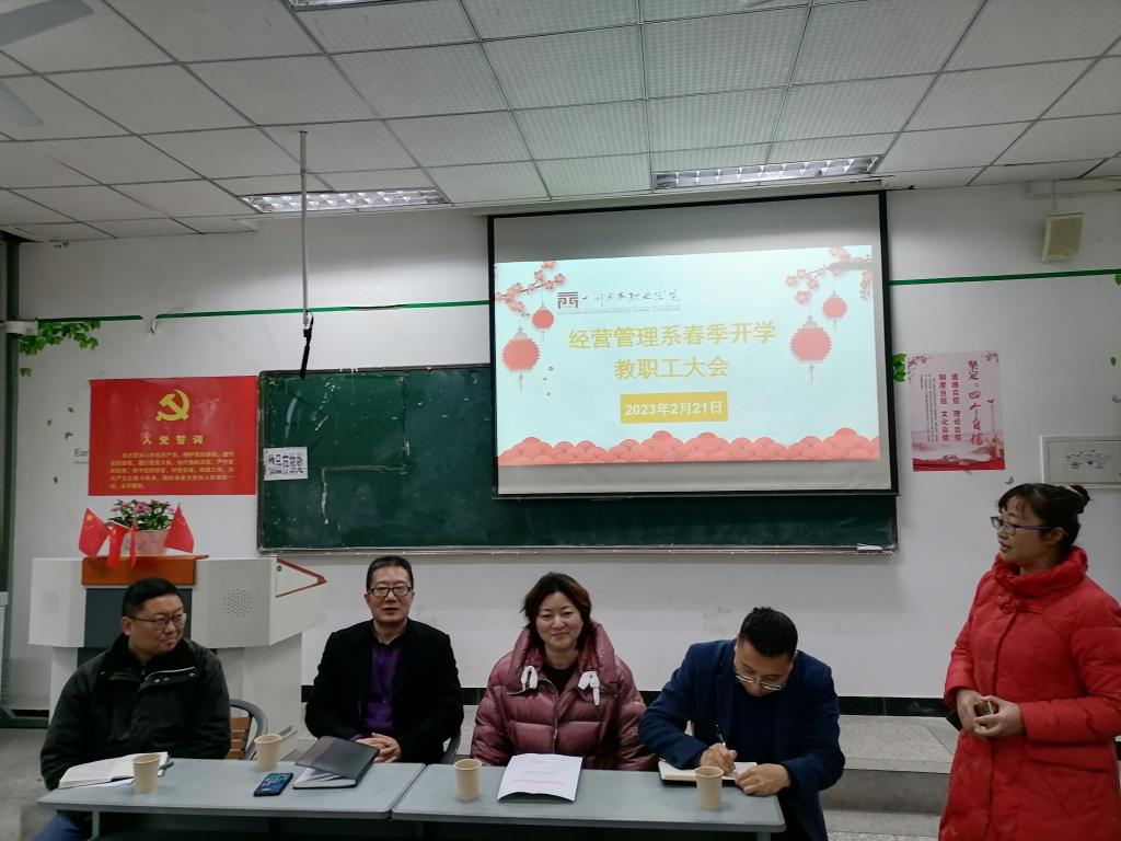 2023年2月21日上午10:00,经营管理系全体教职工于第一教学楼202室召开全系教职工会议。出席本次会议的有学院党委副书记张军同志、学院副院长王军同志、学院组织部副部长王钦同志、经营管理系主任王琦同志、经营管理系...
