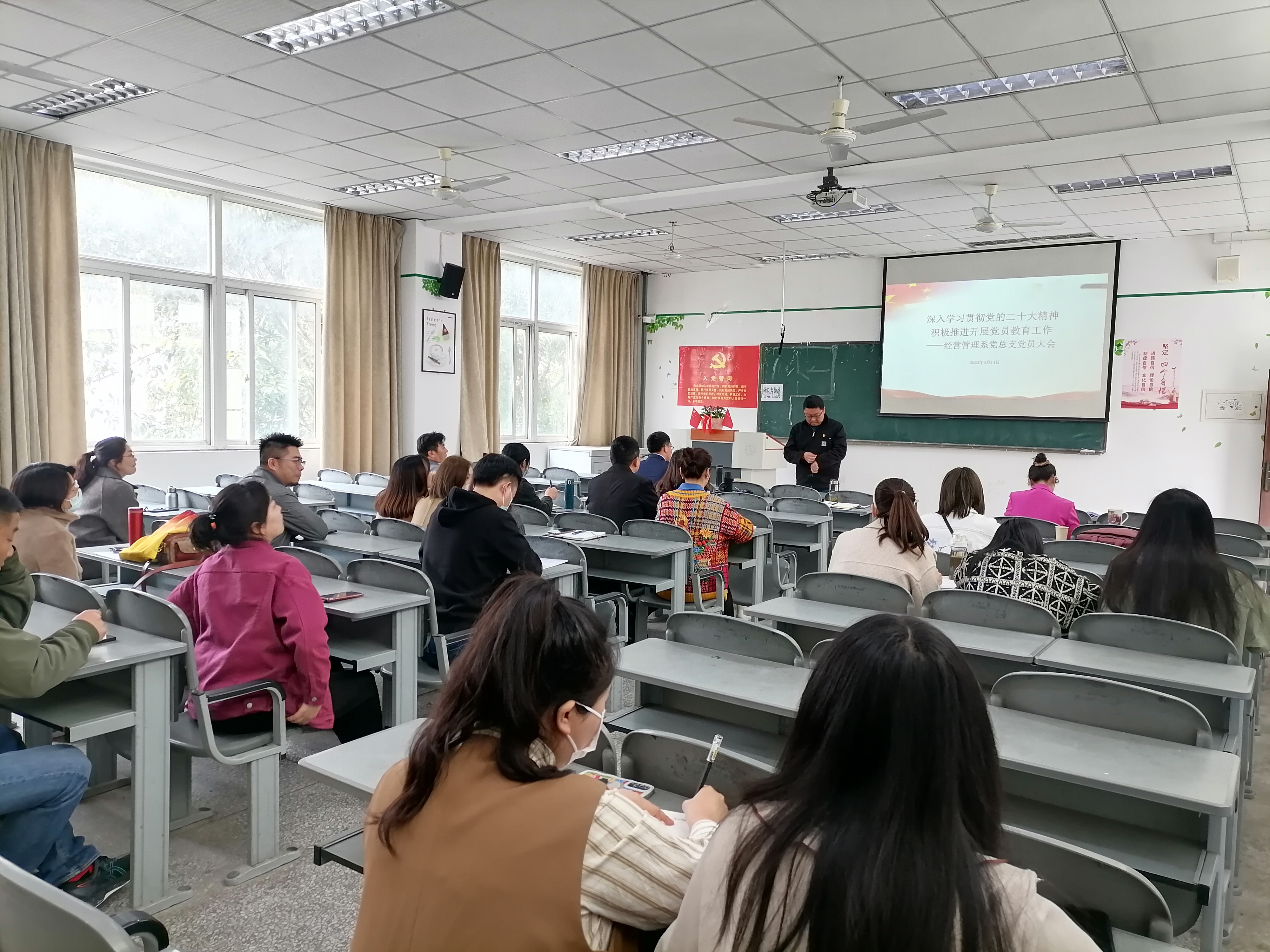 2023年3月14日中午2:00,经营管理系党总支在1教202教室组织召开了以深入学习贯彻党的二十大精神、扎实推进开展党员学习教育工作为主题的全系党员大会,会议由系总支书记杨洪主持。 会上,杨洪传达了《川商院党[2023]...