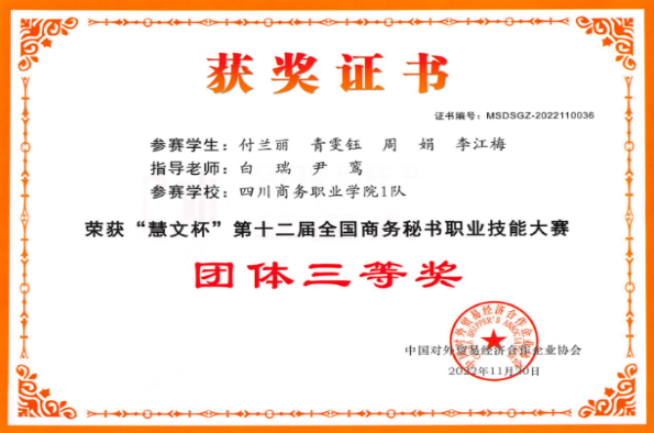 11月19日,“慧文杯”第十二届全国商务秘书职业技能大赛在南京举行。大赛由中国对外贸易经济合作企业协会主办,全国商务秘书与行政助理专家委员会和金陵科技学院承办。根据常态化疫情防控要求,本届大赛大胆创新竞赛形式,采用“线下+线上”相结合的形式进行,参赛规模再创新高。来自全国23个省、市、自治区83所本专科院校的155参赛,近千名师生相聚“线上”,同台竞技。经过激烈角逐,KY开元集团官网二队获团体二等奖,一队获团体三等奖。