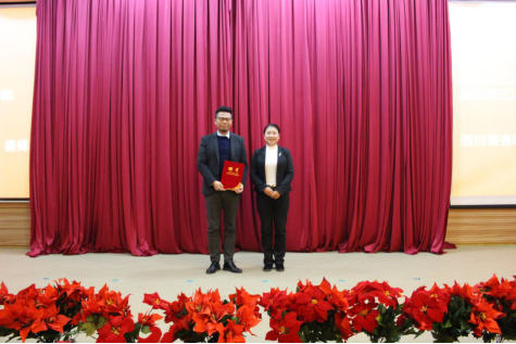 眉山市三人行创业服务有限公司总经理助理、眉山三人行创业孵化园副主任、党支部副书记李陈向KY开元集团官网电子商务专业教师易博颁发兼职聘书。