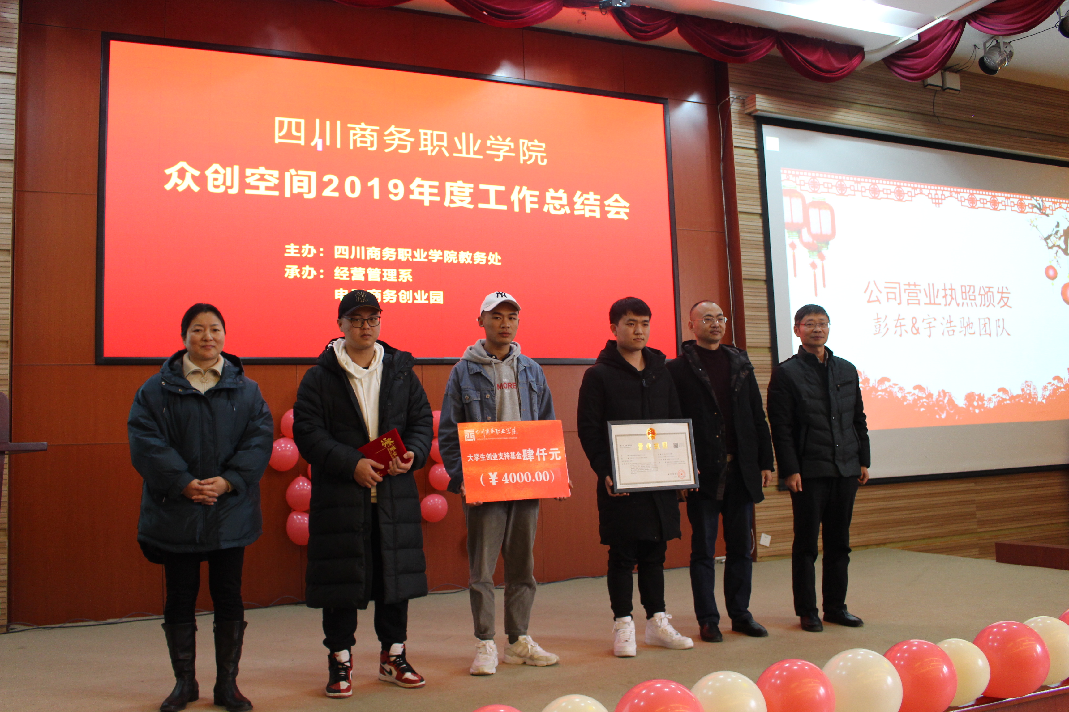 总结会上,学院副院长向宏志致辞并对众创空间第一家公司“成都宇浩驰电子商务有限公司”成立正式表示热烈祝贺。学生处处长王军向新公司“成都宇浩驰电子商务有限公司”颁发荣誉证书、财务资产管理处处长杜先林向新公司“成都宇浩驰电子商务有限公司”颁发“4000元创业资金支持”牌、彭东副局长向新公司“成都宇浩驰电子商务有限公司”颁发营业执照。温江区就业局卢杉杉老师,从创业项目入驻、运营、公司注册、资金支持等方面进行了创业政策宣讲。