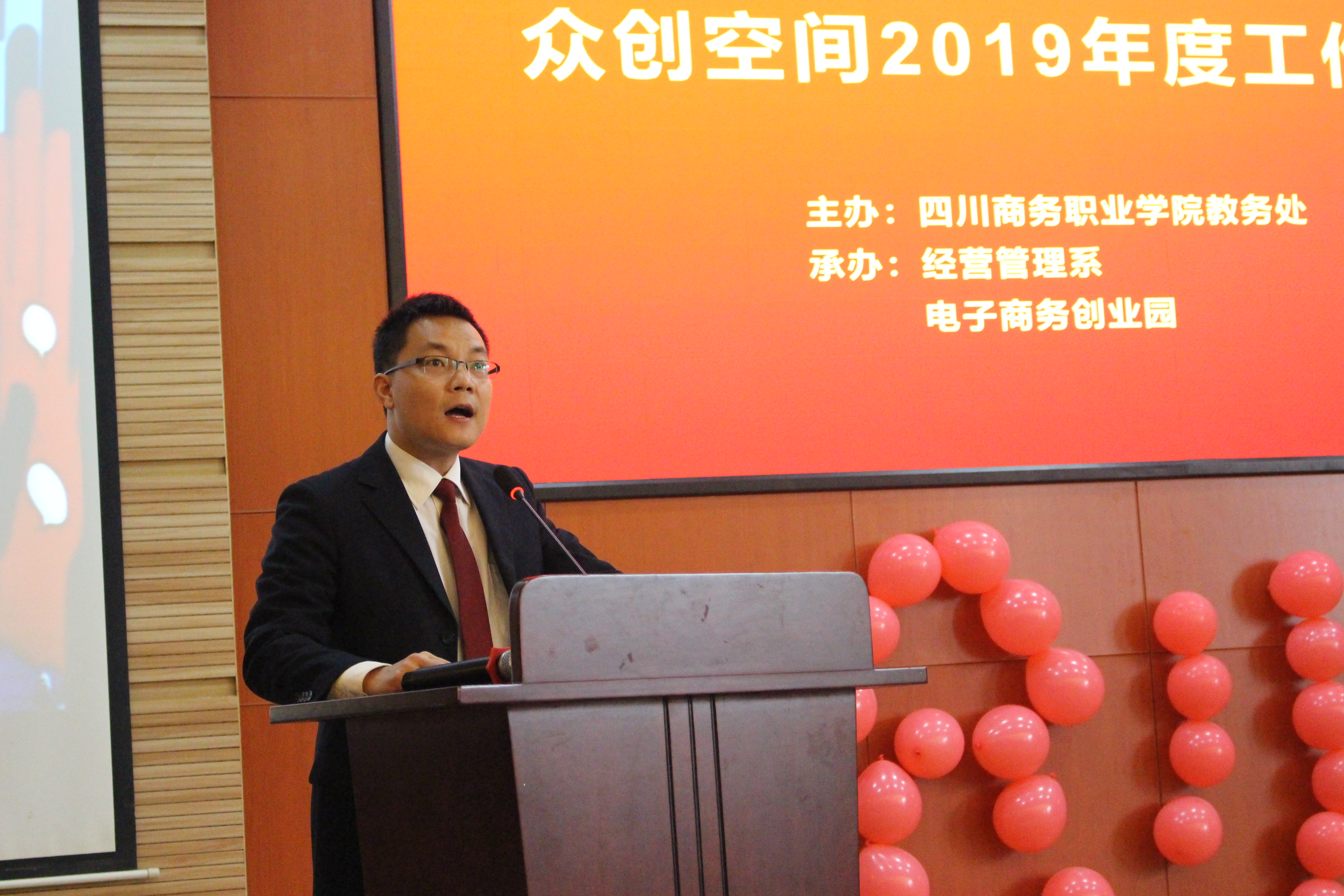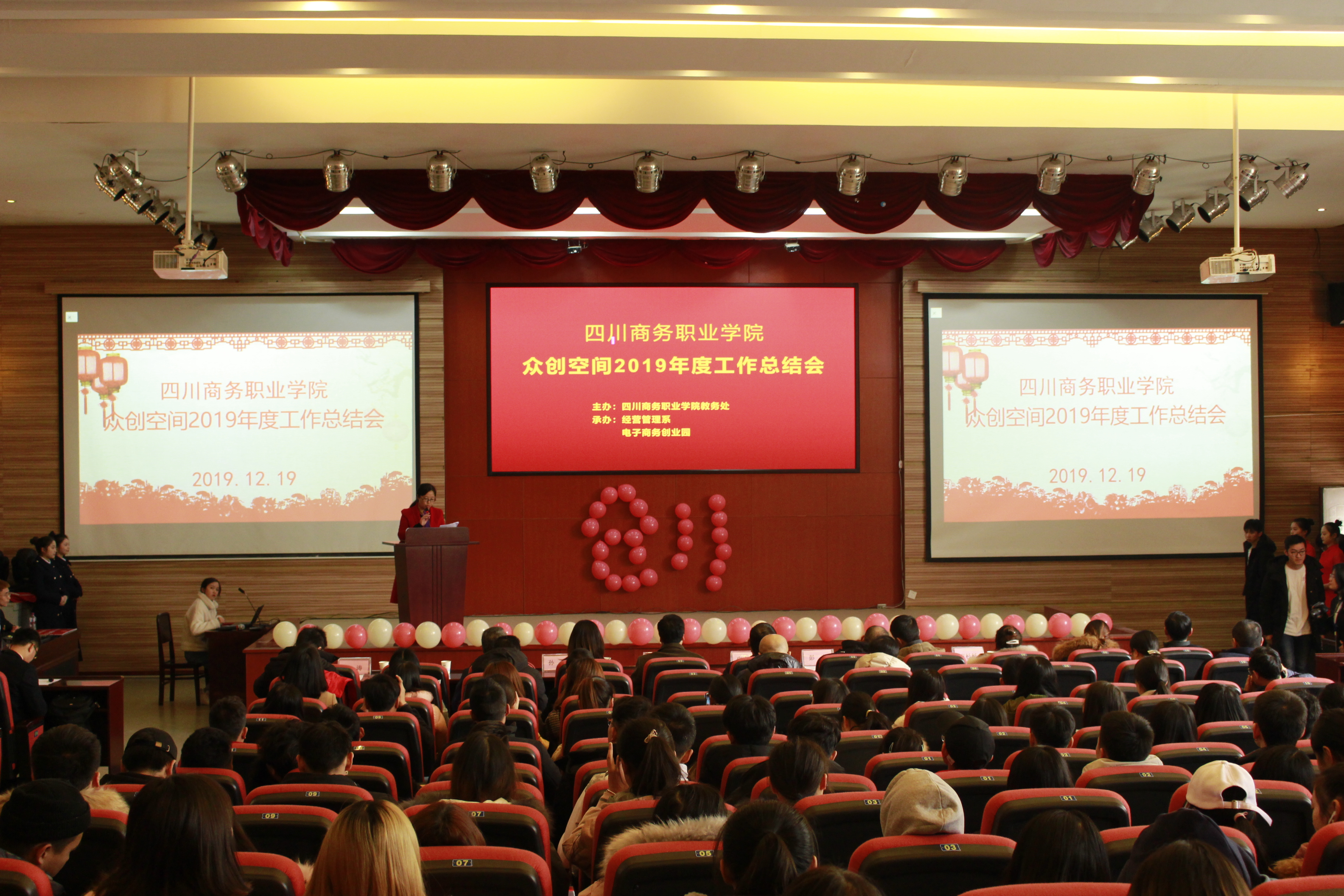 为了深入贯彻落实“《国务院关于推动创新创业高质量发展打造“双创”升级版的意见》(国发〔2018〕32号)”等文件精神,总结2019全年工作,表彰新公司,学院众创空间于12月19日在商务交流中心召开总结大会。出席总结会的有温江区就业局副局长彭东、温江区就业局创业促进科科长易飞、温江区就业局工作人员卢杉杉、眉山市三人行创业服务有限公司总经理冉淋源、三人行创业孵化园主任助理邓涛、眉山市三人行创业服务有限公司孵化事业部部长孙臻、学院副院长向宏志、教务处处长黄松、财务资产管理处处长杜先林、学生工作处处长王军、督导办主任刘小平、经营管理系主任梁栋、经营管理系党总支书记郑海波、经济贸易系主任朱贵水、信息技术系主任赵天宏、会计系副主任李莉、创业指导教师、空间管理团队、以及学生创客齐聚一堂,总结经验,共话发展。会议由经营管理系主办,经营管理系副主任王琦主持。