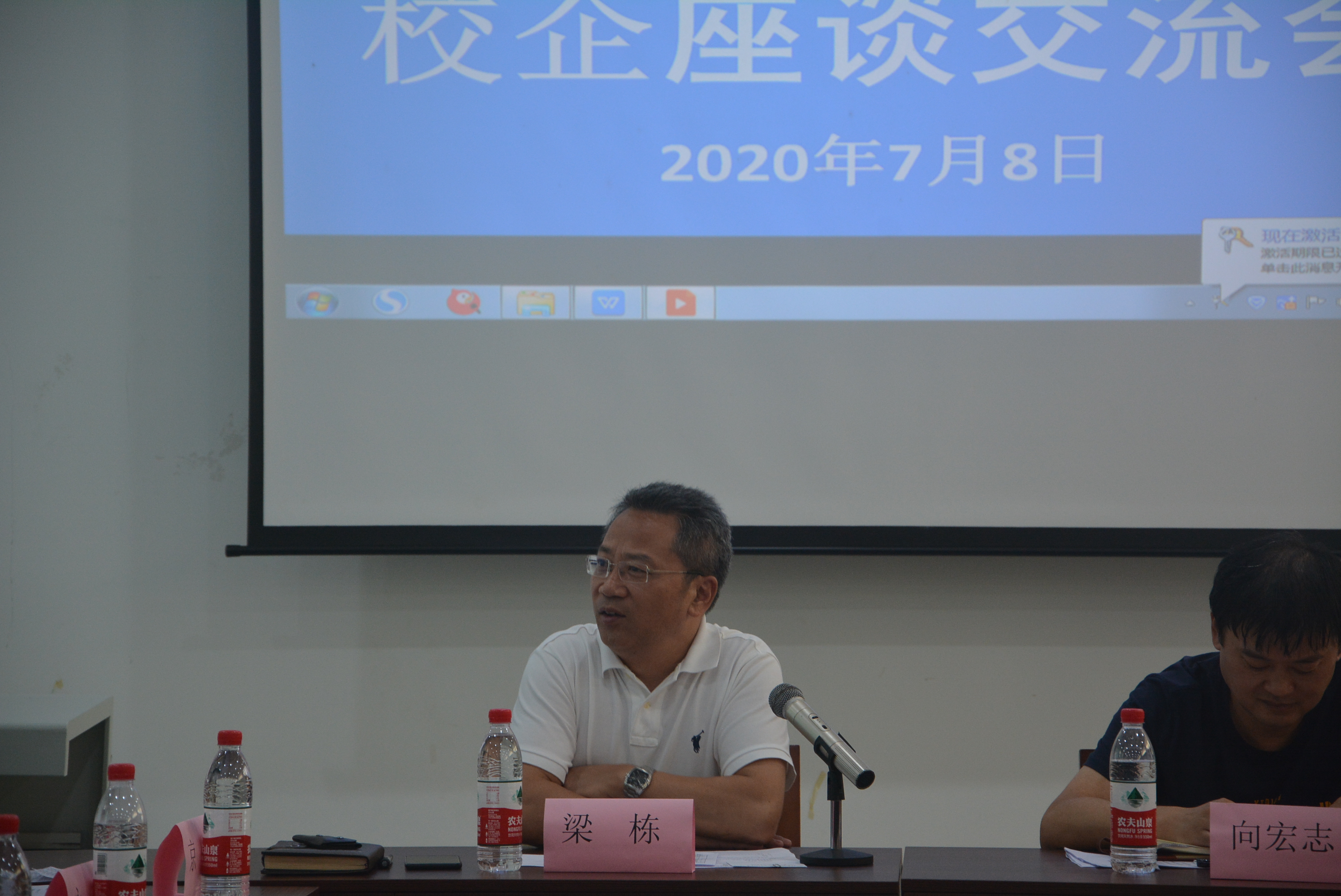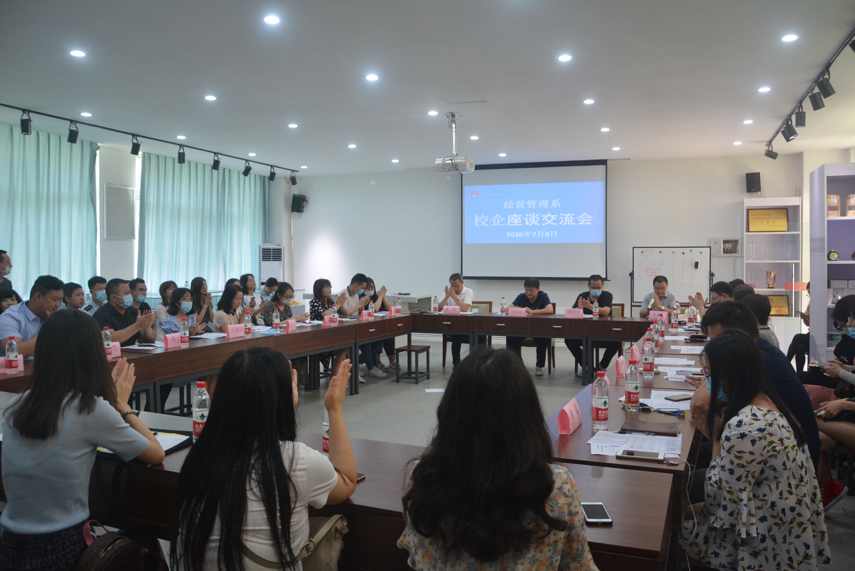 2020年7月8日10:00,经管系于第五教学楼白酒陈列室隆重举行了2018级校企跟岗实习座谈交流大会。出席本次会议的有京东、苏宁、永辉、沃尔玛、柒一拾壹、德邦物流、京东物流、百果园等17家企业的代表;学院副院长向宏志,经管系主任梁栋,经管系党总支书记郑海波,经管系跟岗实习指导老师、18级辅导员。本次会议由经管系朱永泉老师主持。
