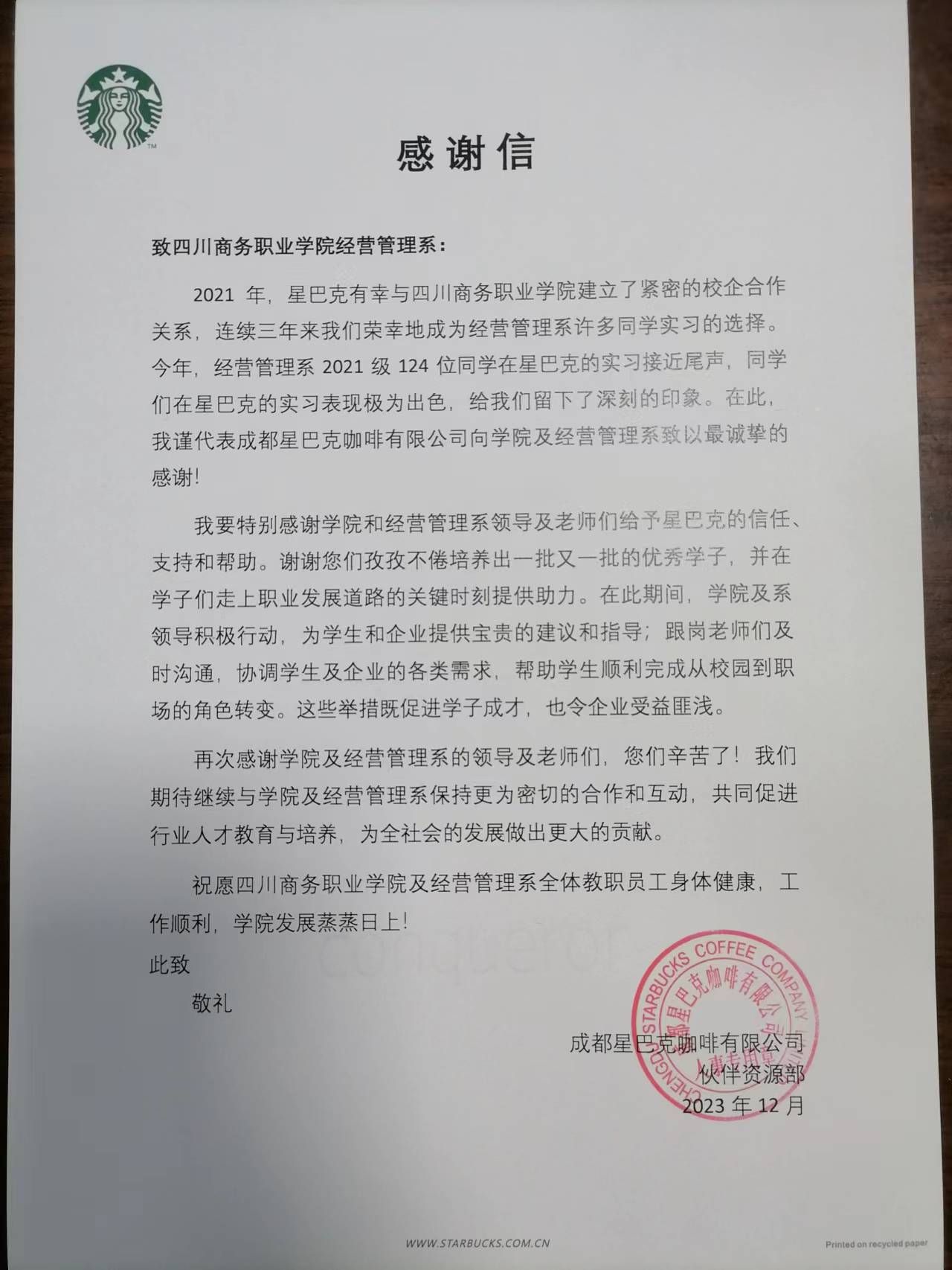 近日,成都星巴克咖啡有限公司向开元官网经营管理系致信,充分肯定和高度评价学院和该系在校企合作工作中对星巴克公司的信任支持和鼎力相助。
