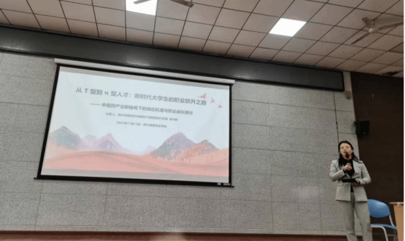 讲座以“蚁群搬石”案例开篇,生动阐释了团队协作在现代职业环境中的关键作用。杨兴群总裁系统解析了“π型人才”培养模式,强调以中医药专业知识为根基,以电商运营、直播技能等跨界能力为拓展,构建“双专长+深跨界”的复合型竞争力。她结合华鼎集团全产业链实践,详细介绍了包括药店店长、直播主播在内的十大岗位发展路径,并指出“实操能力权重达60%”,建议同学们分阶段夯实专业基础、积极提升实战技能。