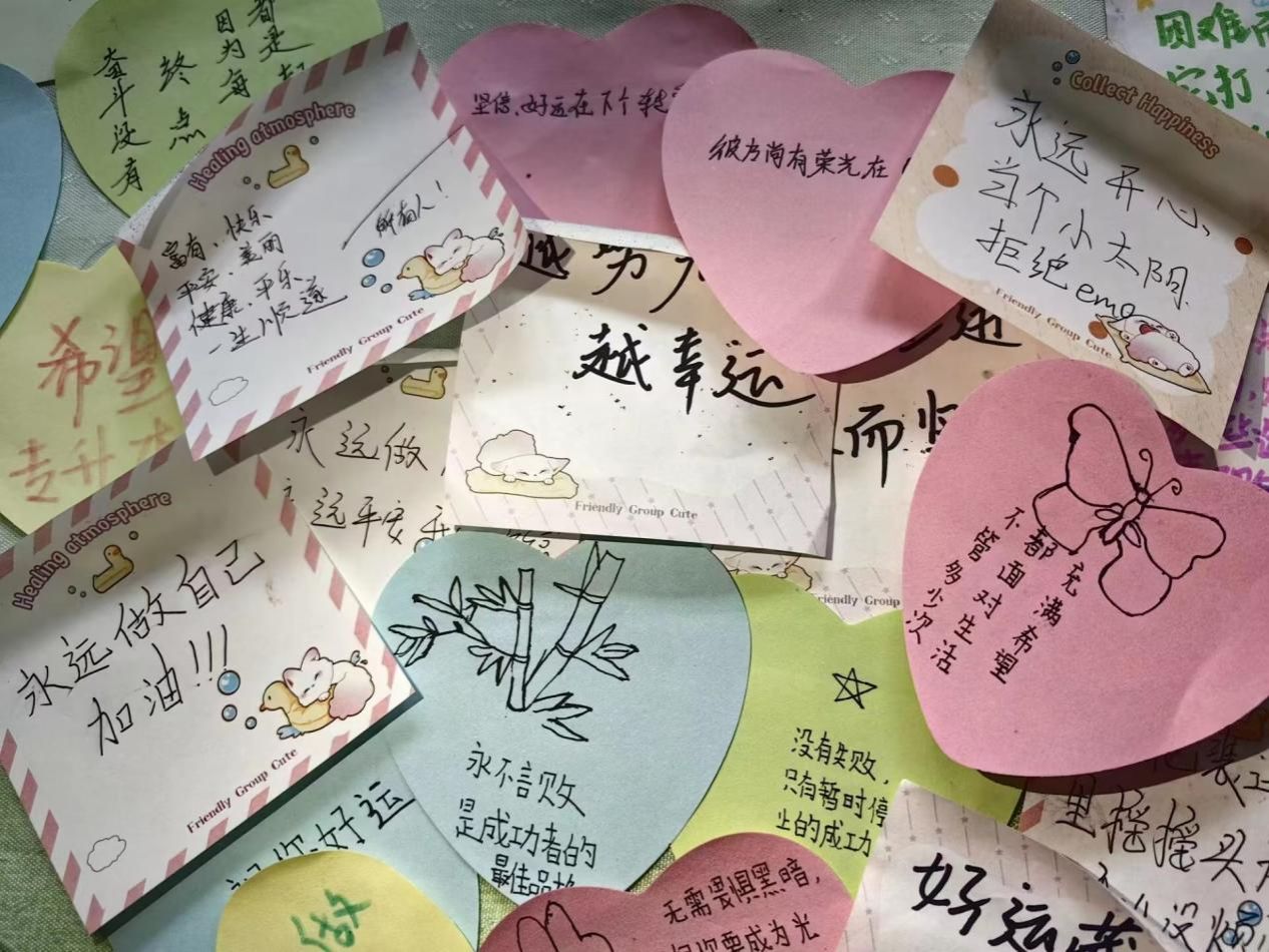 在此次活动过程中,同学们热情高涨,踊跃的在便签纸上写下了自己的烦恼与心声,并在我们的盲盒中留下了许多温暖人心的话语,通过这种形式,把大家的善意与鼓励不断传递下去。