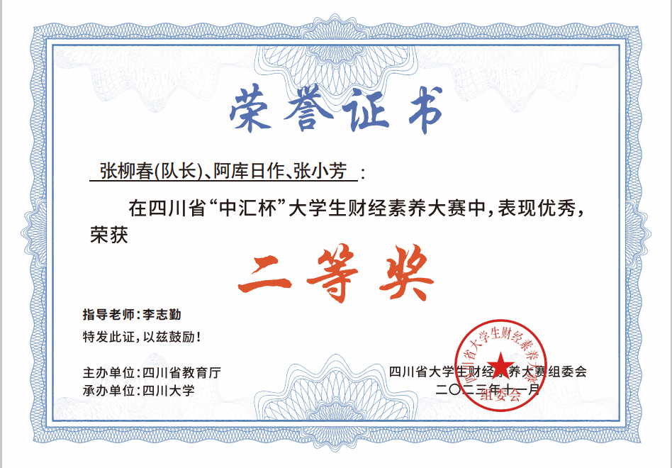 近日,由四川省教育厅主办、四川大学承办的2023年“中汇杯”四川省大学生财经素养大赛决赛落下帷幕,经过激烈的角逐,开元官网李志勤、雷殷睿指导的学生团队获得省赛团体三等奖的好成绩。