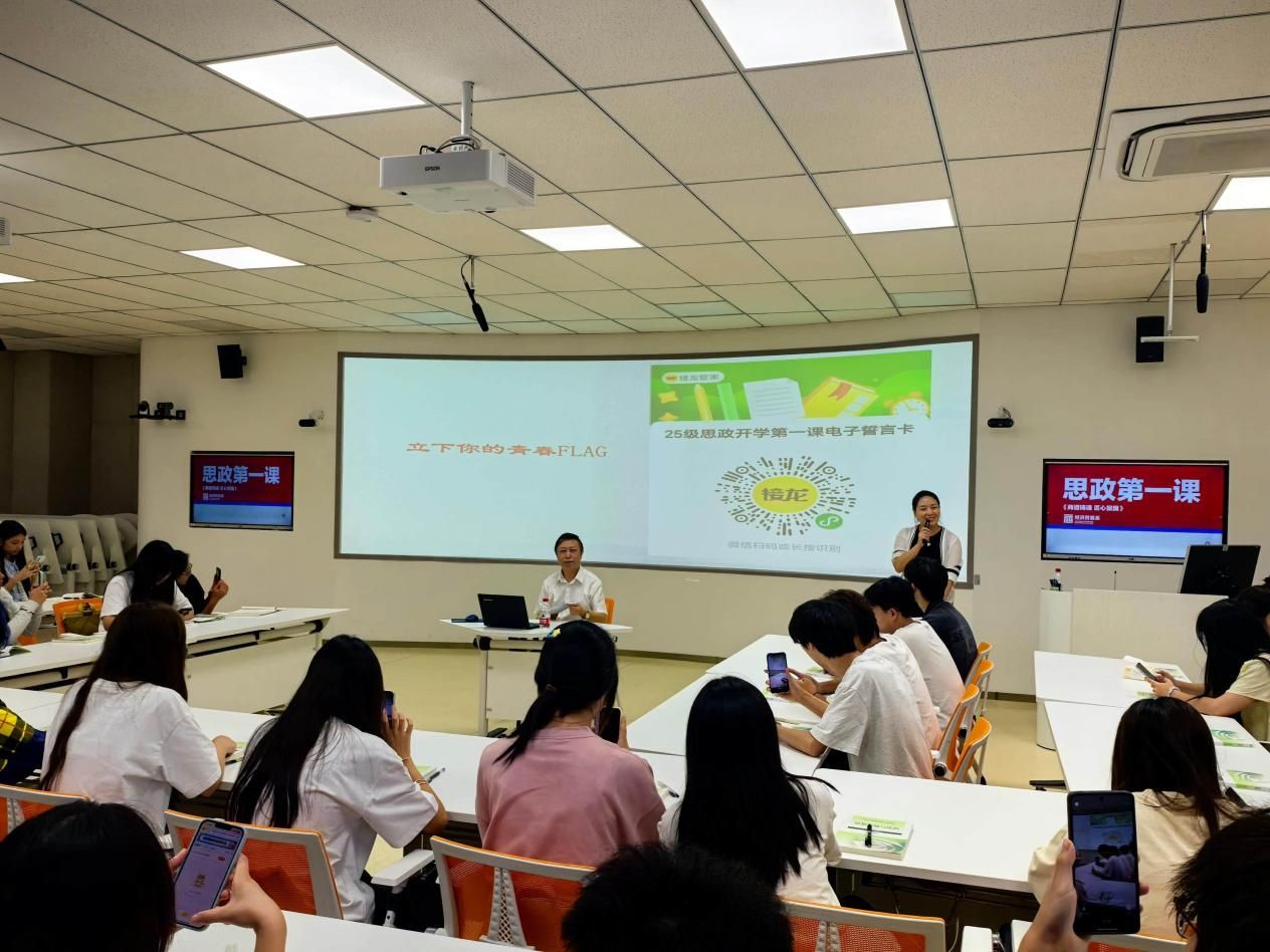 开学典礼落幕之后,唐柯书记走进经济贸易系2025级跨境电商4班的教室,以“商道铸魂,匠心报国”为主题,为同学们讲授了意义非凡的思政第一课。