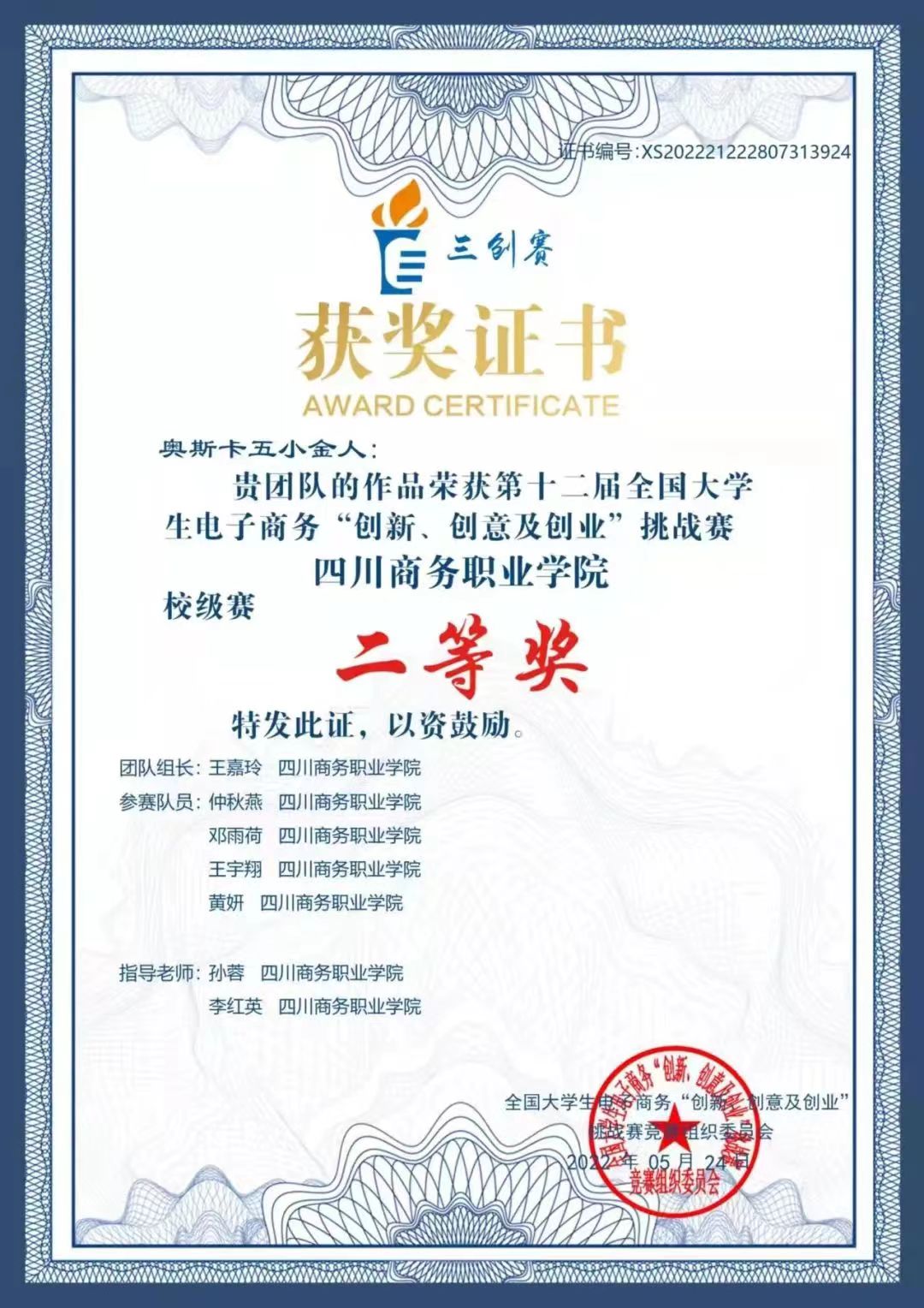 2022年5月28日第十二届全国大学生电子商务“创新,创意及创业”决赛在四川农业大学都江堰校区举行。经过激烈角逐,我系由李红英等老师指导的两支队伍,奥斯卡五小金人队王嘉玲、仲秋燕、邓雨荷、王宇翔、黄妍;demo队许尹齐、陈路林、王意婷、姜丽曾分别荣获校级赛二等奖。本次比赛采取了学生线上答辩,评委、纪检与仲裁线上与线下相结合的方式进行,四川赛区选拔赛分为初赛、复赛和决赛三个阶段。大赛于2021年12月在四川农业大学都江堰校区启动,共吸引了全省62所高校、12107支团队参赛,参赛数量为历年之最、在全国排名第一。