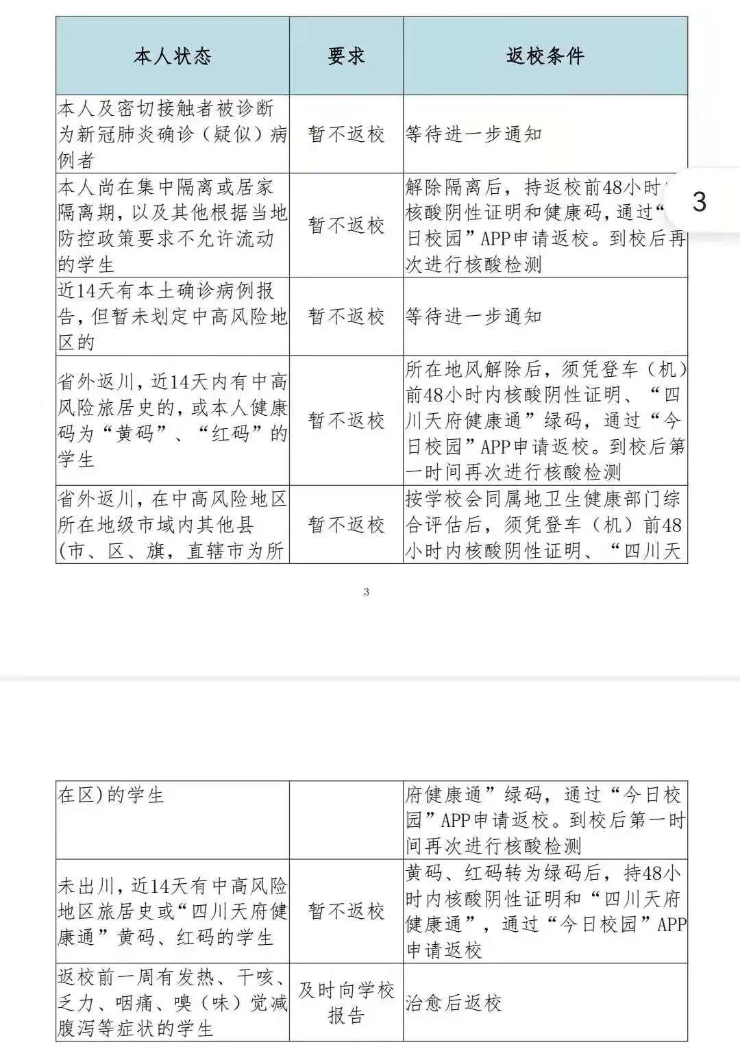 (二)川内学生返校要求低风险地区的学生非必要不离川,不前往省内外中高风险地区。开学前持“四川天府健康通”绿码和返校前48小时内核酸检测阴性证明入校。