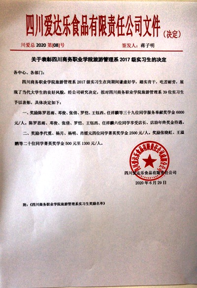6月29日10:00,在学院商务信息交流中心主会场及2个网络分会场,KY开元集团官网与四川爱达乐食品有限公司隆重举行了2020年实习生表彰大会。