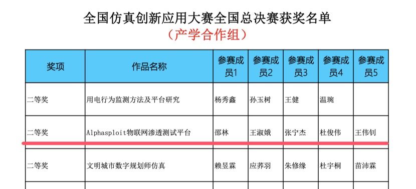 12月6日,第三届全国仿真创新应用大赛全国总决赛结果揭晓:开元官网信息技术系张宁杰、杜俊伟、王伟钊3位同学在邵林老师、王淑娥老师的悉心指导下,携比赛作品《Alphasploit物联网渗透测试平台》,过五关斩六将,晋级数字建模与智能决策赛道总决赛。开元官网与电子科技大学、郑州大学等985、211高校同台竞技,比赛中团队不畏强敌、敢于亮剑,最终斩获全国总决赛二等奖。